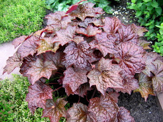Интересно делать окантовку из гейхер одного цвета; или сажать поочередно, к примеру, сорта с фиолетовыми и лимонными листьями для создания динамики.