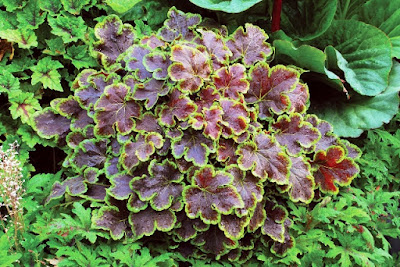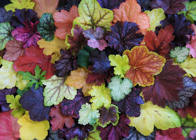 Красный, лимонный, оранжевый, терракотовый, фиолетовый, пурпурный, коричневый и все оттенки зеленого цвета красуются на листьях различных сортов такого модного сейчас растения, как гейхера.